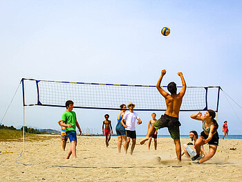 Mit dem Reisebus starten wir in Stuttgart und dann geht’s mit der Fähre ab auf die Insel. Dort schlagen wir nur wenige Meter vom Meer entfernt an der Ostküste nördlich von Aleria unser Camp auf. Hier genießen wir das Meer und unseren Sommer. Nur ein paar Schritte vom Wasser entfernt heißt es: Sonne tanken, Beachvolleyball spielen, zur Strandolympiade antreten oder einfach im Sand relaxen und ins Meer springen.