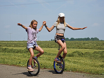 Natürlich dürfen unsere Zirkusgeräte nicht fehlen: vom Trapez über Laufkugeln und Seile bis hin zu Trampolin, Hochrad und Akrobatikmatten. Egal, ob du schon Einrad fahren kannst oder noch nie Zirkusluft geschnuppert hast – hier kann jede*r mitmachen! Und du wirst staunen, wie viel man in ein paar Tagen spielerisch lernen kann.