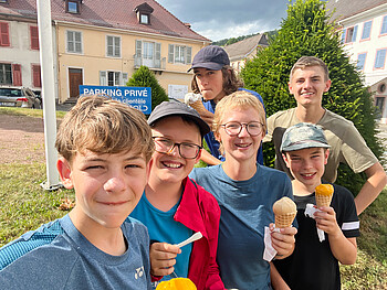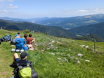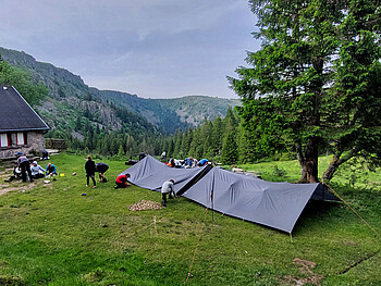 Gemeinsam machen wir uns vom Stuttgarter Hauptbahnhof aus mit Bahn und Bus auf den Weg Richtung Frankeich. Dort angekommen wandern wir teilweise durch beeindruckende Wälder, ein anderes Mal über der Baumgrenze und genießen die schöne Aussicht in alle Richtungen. Auf der einen Seite ein steil abfallender Gebirgsrand, auf der anderen ein nur allmählich an Höhe verlierendes Plateau. Wo es uns besonders gut gefällt, machen wir eine längere Pause oder legen einen Ruhetag ein. Wenn wir gerade nicht unterwegs sind, spielen wir Spiele, liegen in der Sonne oder schauen auf der Karte, wo uns der Weg als nächstes hinführt.