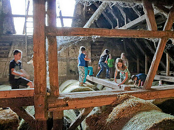 Lust, auf einem Biobauernhof zu zelten? Dich erwartet eine spannende und abwechslungsreiche Woche. Außer uns wohnen Kühe, Katzen und andere Tiere auf dem Hof. Beim Helfen lernen wir einiges über die Arbeit auf einem Bauernhof.